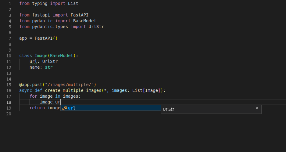 For example, as in the Image model we have a url field, we can declare it to be an instance of Pydantic's HttpUrl instead of a str: